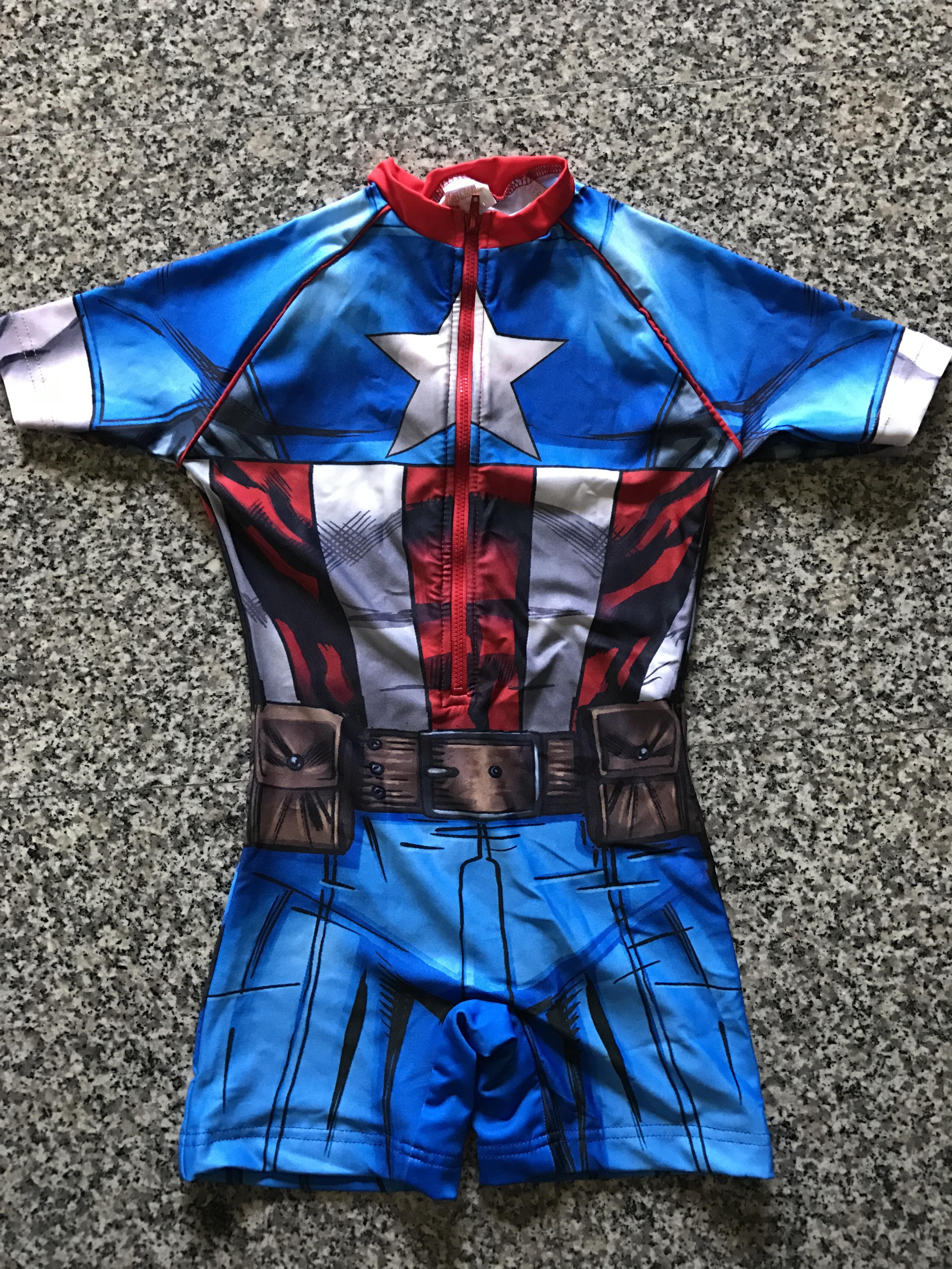 ↳ (size S)ชุดว่ายน้ำเด็กผู้ชาย Super Hero Captain America ชุดบอดี้สูทเสื้อแขนสั้นกางเกงขาสั้นซิบหน้า สีน้ำเงิน สกรีนลายชุด Captain America เสมือนจริง มาพร้อมหมวกว่ายน้ำและถุงผ้า สุดเท่ห์ ใส่สบาย ลิขสิทธิ์แท้(สำหรับเด็กอายุ 4-5 ปี)