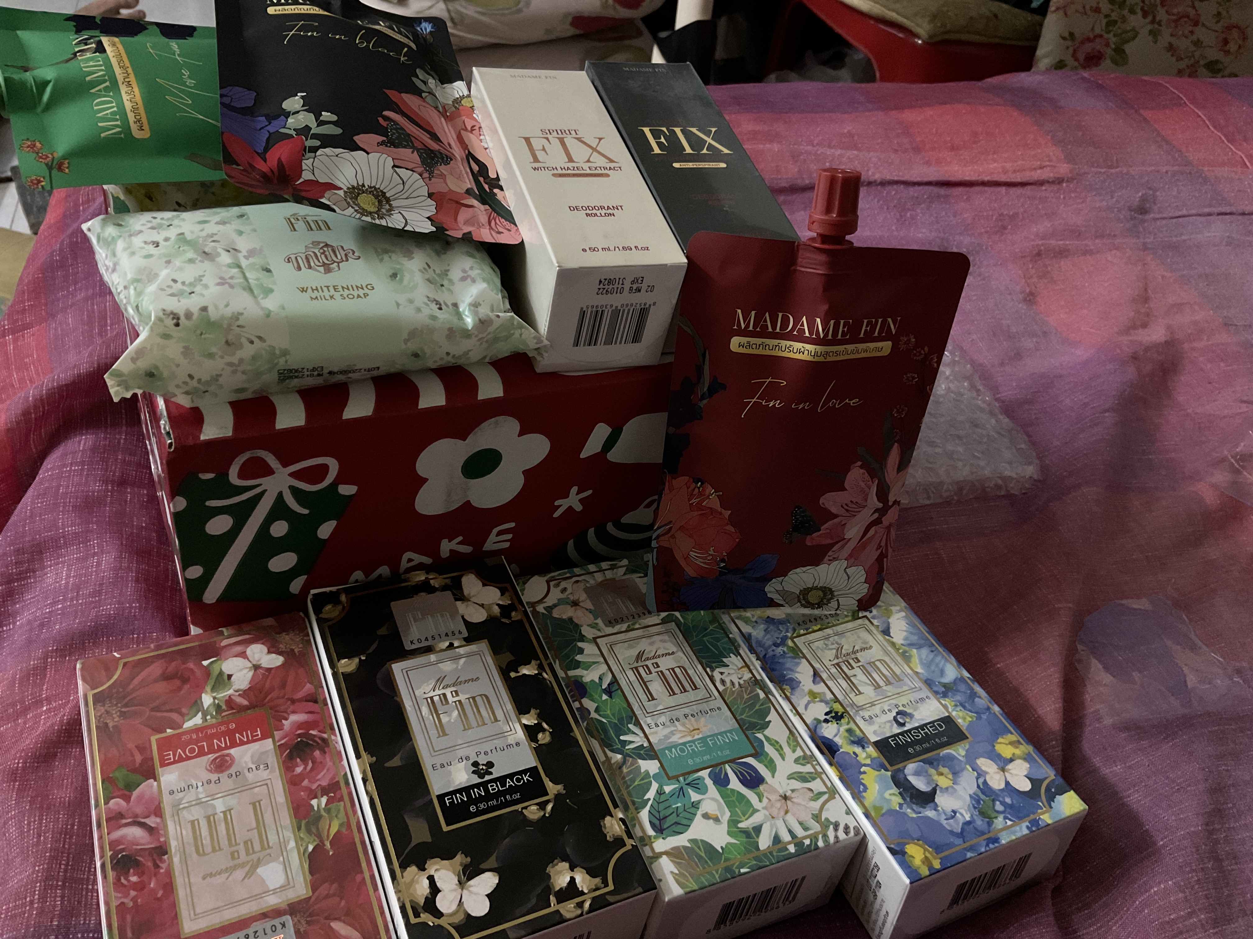 น้ำหอมมาดามฟิน ( โปร C4 ) น้ำหอมคลาสสิค 4 ขวด น้ำยาปรับผ้านุ่ม 3 ห่อ โรลออนFIX 2 ขวด สบู่น้ำนม 2 ก้อน