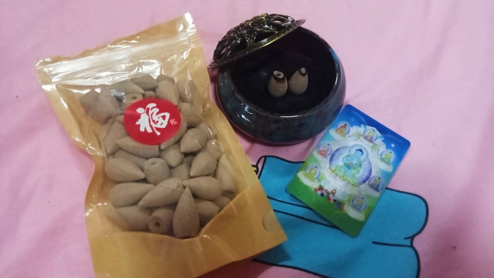 มีแถมการ์ดรูปพระมาด้วยค่ะ ไม่แน่ใจว่าใช้สำหรับอะไร ส่วนกำยานเห็นบอกเป็นกลิ่นมะลิหมื่นลี้ เราได้กลิ่นตุๆอย่างเดียวค่ะ พอจุดก็กลิ่นควัน แต่ทิ้งไว้ไม่ถึง 2 นาที ก็ไม่มีควัน ไม่มีอะไรเลย มันปกติไหมคะ มันต้องใช้ยังไง เราไม่เข้าใจ